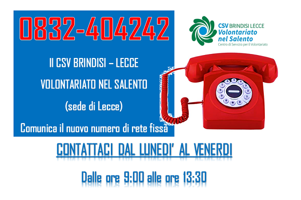 Il CSV Brindisi-Lecce Volontariato nel Salento, comunica che per ragioni tecniche il numero da comporre per contattare i proprio uffici (delegazione di Lecce) è il seguente: 0832 404242 .Presto sarà disponibile il nuovo sito con tutti i contatti mail aggiornati e le novità sul nostro Centro Servizi.